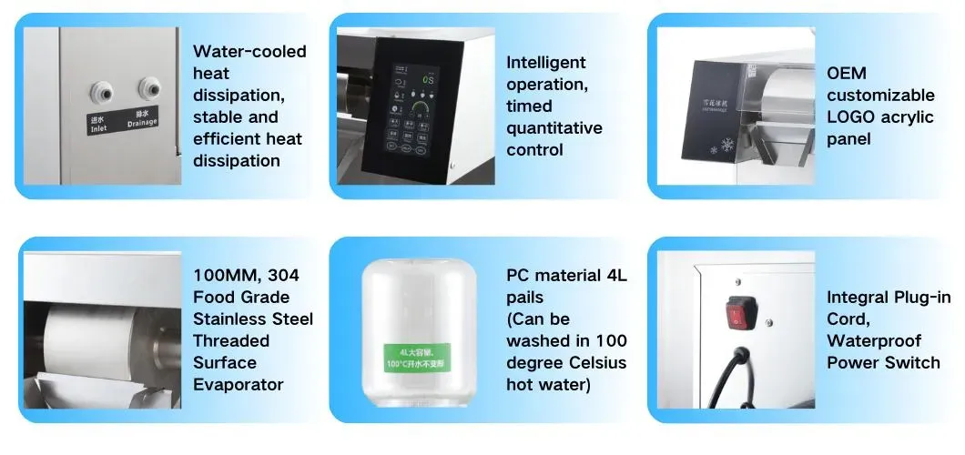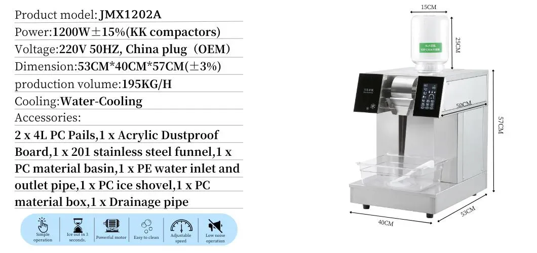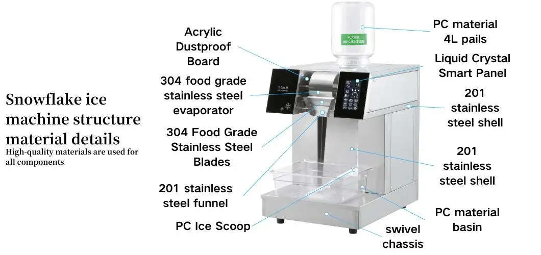 - Accessoires: Accessoires : 2 seaux en PC de 4L, 1 panneau anti-poussière en acrylique, 1 entonnoir en acier inoxydable 201, 1 cuvette en PC, 1 tuyau d'entrée et de sortie d'eau en PE, 1 pelle à glace en PC, 1 boîte à matériel en PC, 1 tuyau de drainage.